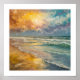 This stunning oil painting captures the breathtaking beauty of a golden sunset on a sandy beach. The vibrant hues of orange, yellow, and purple paint the sky, while the gentle waves of the ocean lap at the shore. This piece is sure to add a touch of tranquillity and serenity to any home or office.
