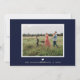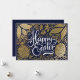 Elegant golden Easter photo card. Happy Easter script framed with leaves, flowers and eggs in pretty faux gold foil on navy blue background. Back of card features single photo template and text line for name and year with coordinating blue color background.
