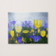 Sunny yellow and blue tulips stand out in a field on a cool, misty spring morning. In the early sunlight they stand out like golden cups of light.