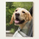 Sunday drive through country, on tree-covered dirt road with labrador retriever. Dog has his head out window and looks happy to be going for ride and appears to be smiling.