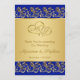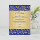 Golden leafy swirls and joined hearts on a royal blue background Wedding Menu Card.