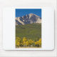 An autumn scenic landscape view of the Colorado Rocky Mountains Longs Peak 14,256 feet high in elevation with golden aspen trees.