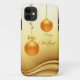 A beautiful and elegant Christmas illustration with golden ornaments and a decorative script Merry Christmas. greeting all on a modern and festive gold and white winter background.