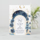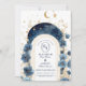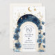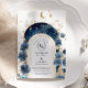 A luxurious celestial-themed wedding design featuring a midnight blue floral garden, shimmering gold accents, and a golden crescent moon framed by an ornate arch. Perfect for couples seeking a romantic, mystical, and starry-night-inspired celebration with elegant cosmic details.