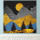 Abstract mountain landscape design in bold shades of gold, black, and blue with a moonrise and birds.