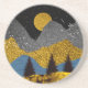 Abstract mountain landscape design in bold shades of gold, black, and blue with a moonrise and birds.