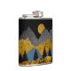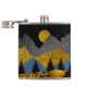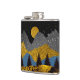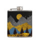 Abstract mountain landscape design in bold shades of gold, black, and blue with a moonrise and birds.