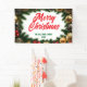 At the centre, the banner displays the text “Merry Christmas” in a bold, flowing script in deep red, standing out beautifully against the festive background. Below this, there’s space for customizable text, allowing you to add your family name and the year, making it a unique and personal decoration.