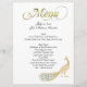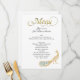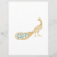 Elegant wedding reception table menus done in white, with graphics of a gold tone and coloured beaded looking peacock, on the bottom. Menu in gold tone fancy graphic script text, decorates the top of the menu. All the black text is ready to personalize for your wedding reception.