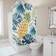 A large golden pineapple on a blue and green coloured palm tree leaves foliage pattern. White background.