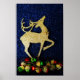 Golden reindeer standing in a pile of jingle bells against a glittering blue background. All Rights Reserved © 2012 Jennifer Kelly