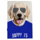 Golden Retriever dog with blue t-shirt and aviator sunglasses for 75th birthday.