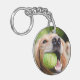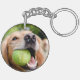 Un gros plan d'un Golden Retriever avec une balle de tennis jaune dans la bouche.