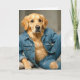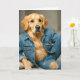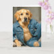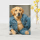 A golden retriever dog is dressed in a stylish denim jacket and ripped jeans, lounging casually on a pillow against a blurred background.