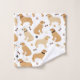 Cute Golden Retriever dogs with dark and light coats sit and stand with scattered dog bones and pawprints on a white background.