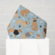 Cute Golden Retriever dogs with dark and light coats sit and stand with scattered dog bones and pawprints on a blue background.