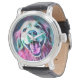 Add a little golden happiness to your day with this cute watch! Design features an art portrait of a smiling golden retriever dog, who is rendered in shades of hot pink and teal.