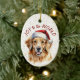 On the front of this Holiday ornament is a cute image of a Golden Retriever dog dressed up in a Santa Claus hat. Behind the image is a gold confetti sprinkle background. Red text says "Joy to the World". The back of the ornament has the same confetti background and text fields for you to personalize each ornament.