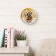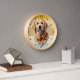 A portrait of a beautiful Golden Retriever Dog is the feature on this clock. The image is placed on a retro, slightly distressed striped sunset background. Dark gold numbers and diamond shaped markers around the perimeter make the clock easy to read. Perfect for anyone who has lost their heart to a Golden.