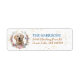 The left side of these return address labels feature an image of a spring flower wreath in colours of soft pink, blue, gold, green and cream. At the centre is a portrait of a Golden Retriever Dog. Tiny gold confetti gives a subtle sparkle to the background. Your custom text is in blue and brown gold at the right.
