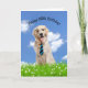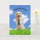 Golden retriever with striped necktie and eyeglasses in grass and flowers for 85th birthday.