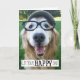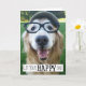 It's a happy day! This card features a photograph of a smiling golden retriever dog who's wearing a hat and glasses. Text on front reads, "Get Your Happy On!" while inside customizable text states, "Hope you have a great day!"