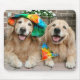 Feeling groovy? This mousepad features two golden retriever dogs outside, smiling and wearing wearing tie-dyed clothing.