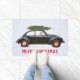 Golden retriever dog driving a retro black car in snowflakes with green Christmas pine tree on roof.