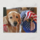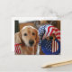 Happy 4th of July! Show your patriotic spirit with this cute golden retriever postcard! Design features two dogs celebrating Independence Day with red, white, and blue flags, bandanas, and flying discs.
