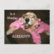 This funny postcard features a photograph of a cute golden retriever dog in glasses and pink robe and curlers, along with the phrase, "Is it Monday already?!"