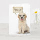 Cute golden retriever puppy wearing glasses on white with speech bubble for 104th birthday.