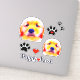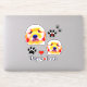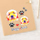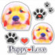 Here's a grouping of cute and vibrant dog stickers! Designs feature two vibrant art paintings of a cute golden retriever puppy, rendered in shades of blue, yellow and orange, black paw prints, a red heart, and the phrase "puppy love."