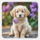 A fluffy golden retriever puppy sits sweetly, holding a sprig of purple flowers in its mouth.