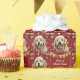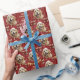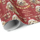 The repeated pattern on this pretty Christmas wrapping paper is a portrait of a beautiful Golden Retriever wearing a red and white Santa Claus hat. Along with the dog images is an elegant matching red banner decorated with gold design pennants at the top. Your custom text is in pale gold in three fields for you to customize.