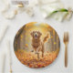 A joyful golden retriever dog runs through an autumn forest surrounded by colourful falling leaves
