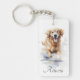 Keyring featuring a beautiful watercolor painting of a Golden retriever running through water and customizable text, for example a name.
