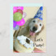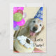 This party invitation features a photograph of a smiling golden retriever dog who is wearing a birthday hat, surrounded by colourful balloons and a cake. Text on front reads, "Let's Party!" Customize the back with all the details of your big day! Matching party supplies available!