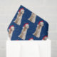 Golden retriever with Santa Claus cap on blue background with snowflakes.
