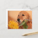 Here's a flower for you! This postcard features a photograph of a cute golden retriever dog holding a yellow flower in his mouth.