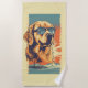 Golden-retriever with sunglasses at a beach towel