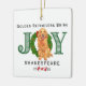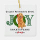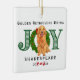 This ornament features a cute Golden Retriever sitting in front of a wreath. The wreath makes up the letter “O” in joy. Above the Golden Retriever, it reads, “Golden Retrievers Bring.” The complete message on the ornament reads, “Golden Retrievers Bring Joy.” You personalize the ornament with your dog’s name. Under your dog’s name, there is a candy-striped bone and the year 2024. The candy-striped dog bone appears again on the back of the ornament at the lower portion of the ornament. You can type a sweet note to your fur baby on the back if you desire.