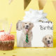 Cute Golden Retrievers with striped neckties and Happy Birthday text on white background.