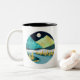 A beautiful landscape with unique textures showing a river and mountain landscape with a rising moon and starry sky in shades of blue, gold, dark green, and yellow.