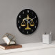 A clock with an image of golden scales on a black background. Simple and elegant.