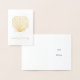 This card template is in metallic gold and white. It features a scallop shell line drawing and personalized script message on the front of the card. The inside has script text that can be personalized.