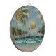 Dive into a fantastical tropical paradise where the sun's golden light transforms the world. This whimsical artwork captures a serene beach scene, where the sand shimmers with a soft, warm glow. Towering palm trees and majestic cliffs are not just silhouettes against the sky, but are rendered in pure gold, reflecting the radiant brilliance of the sun. The water gently laps at the shore, inviting you to step into a world of pure imagination and escape.