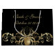 Customize for Halloween trick or Treat bag or use for Wedding or Birthday gift giving for that PSider lover - text is easily personalized - Oddly Elegant, extremely unique, this Glistening gold spiders on webs in front of a black background-May not be for everyone but definitely very unique and oddly enough this is so elegant as the webs sparkle - very elegant collection for Halloween, your wedding or anniversary. This is a great Halloween Wedding choice. Perhaps a wedding for a pest control specialist NOTE: ALL Adornments are digitally created to appear real, they are only a printed design. MORE Matching Products in my Shop - http://www.zazzle.com/wedding_trends in the category Gold Spiders
