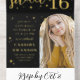 All in one Sweet 16 invitation perfect for a starry night theme with a black background, gold foil fonts, and little gold foil stars and flares similar to a starry sky at night. Add a photo of the birthday girl in an arch shape.