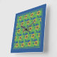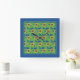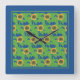 A bright, attractive square Wall Clock, with a pattern of golden yellow sunflowers on a deep blue background, from a screenprint by Judy Adamson.