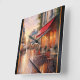 A cozy Parisian street scene is depicted at sunset, with warm light glowing from a cafe and reflecting on wet cobblestones. Rain-dusted tables and chairs line the quiet street, while trees and buildings form a charming backdrop. Read The Story At: https://xzendor7.com/golden-sunset-light-on-a-rainy-town-cafe-by-xzendor7/